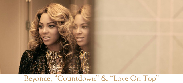 “Love On Top” because it’s classic B, “Countdown” because it’s an entirely new side of B. Beyonce, “Love On Top (download) + Beyonce, “Countdown” (download)